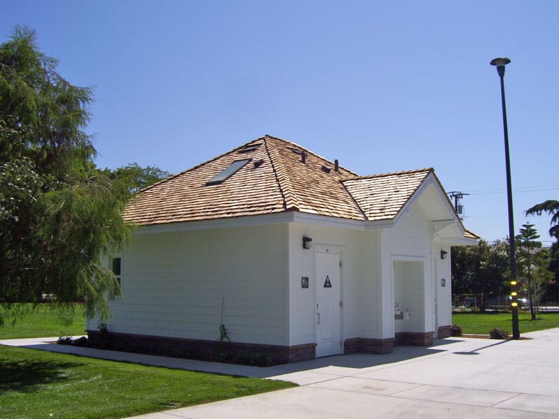Kickproof wall vent that ventilates the interior of the restroom through a CMU wall.