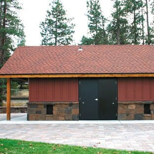Bend was really inviting Romtec to stretch their design wings and come up with a unique and knock-out restroom design specifically geared to this beautiful park, and Romtec did just that. They designed a building with a unique roof structure, including rough-sawn lumber truss details at both ends, mimicking the unique picnic shelter. The exterior would have a custom red wood stain over cedar siding, with a stone wainscoting harvested from a local Bend quarry, matching the pavilion and surrounding rock walls. The roof was three-tab shingle over an ice-shield barrier, also matching the pavilion. The restroom building was winterized with an insulation package, including the Lexan windows. In-floor heating was chosen to provide heat, giving a long life solution without exposed fixtures. Vandal resistant stainless steel fixtures and energy efficient lighting were provided to help the city handle the volume of traffic expected at the park and public restrooms and make cleaning and maintenance easier. The end result is stunning and has quickly become one of Romtec’s signature buildings, showing what they are capable of providing to all their customers.
