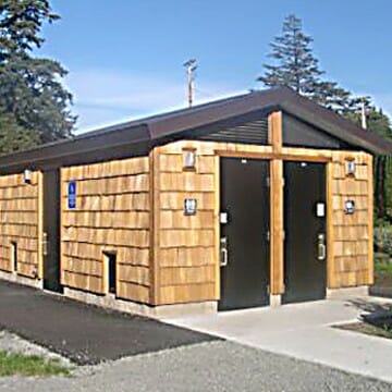 Romtec designed a longer version of our Sierra Quattro building that would accommodate the unisex and handicapped accessible toilet and shower rooms as well as a large storage/office area. They provided commercial china fixtures that look like home but hold up to the demands of a commercial environment. Each restroom and shower room allows for individual use while also accommodating those with special needs as well as those adults with a few kids in tow. All are afforded the ease of use, privacy and security they want. A unique cedar-shake siding was chosen for the exterior, giving that beach bungalow look that will appropriately grey with age and weather affects. The Cascade Locks Campground received an attractive facility, meeting all of the needs of their patrons, designed specifically to their unique requirements.