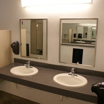 All components in the restroom-shower building such as the doors, frames, windows, vents, toilets, sinks, faucets, showers, benches, drinking fountain, mirrors, and restroom stall dividers are heavy duty commercial grade products that are still functional and very attractive, offering long life, durability, functionality, and beauty.