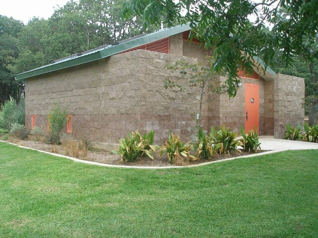 Chisholm Park in Hurst, Texas is the city’s largest park, covering 50 acres. The park has many amenities including an aquatics center, four lighted baseball/softball fields, two lighted basketball courts, two playgrounds, three pavilions on a jogging/walking trail, and a pond with a fishing island. For this busy park Romtec supplied a large, multi-user restroom building complete with men’s and women’s facilities designed to meet ADA requirements. The orange colored doors and vents compliment the brightly colored structures located around the park.