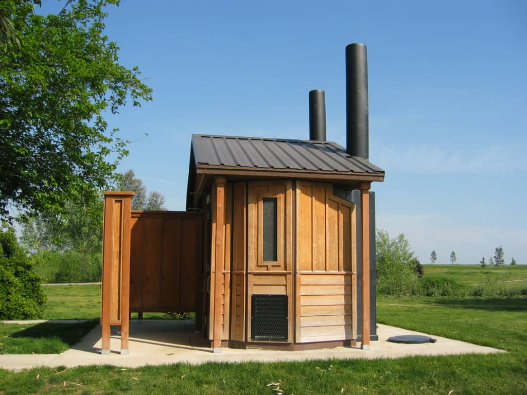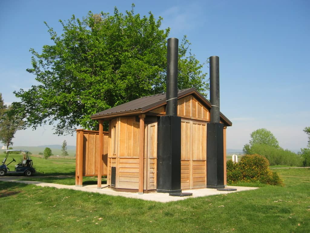 On this manicured playing field sits a unique Romtec waterless restroom that helps show off the park’s beauty and success. The restroom’s simplicity and natural wood siding create an attractive aesthetic that compliments the course’s fresh grass and vegetation.