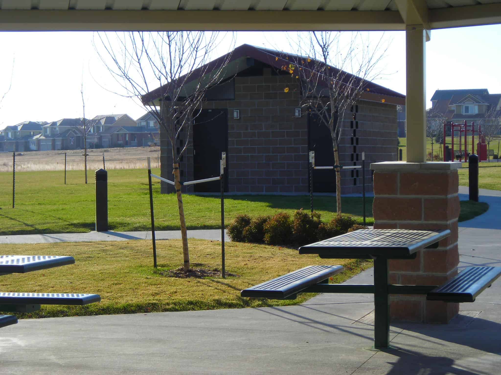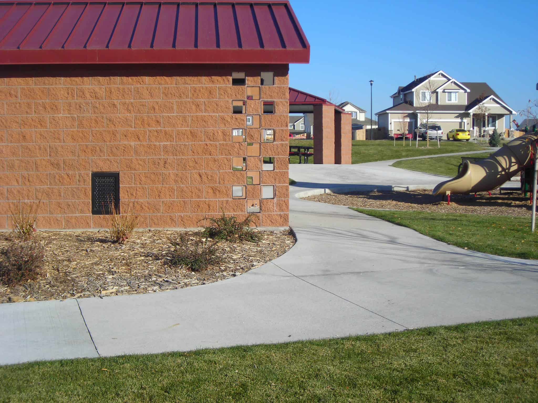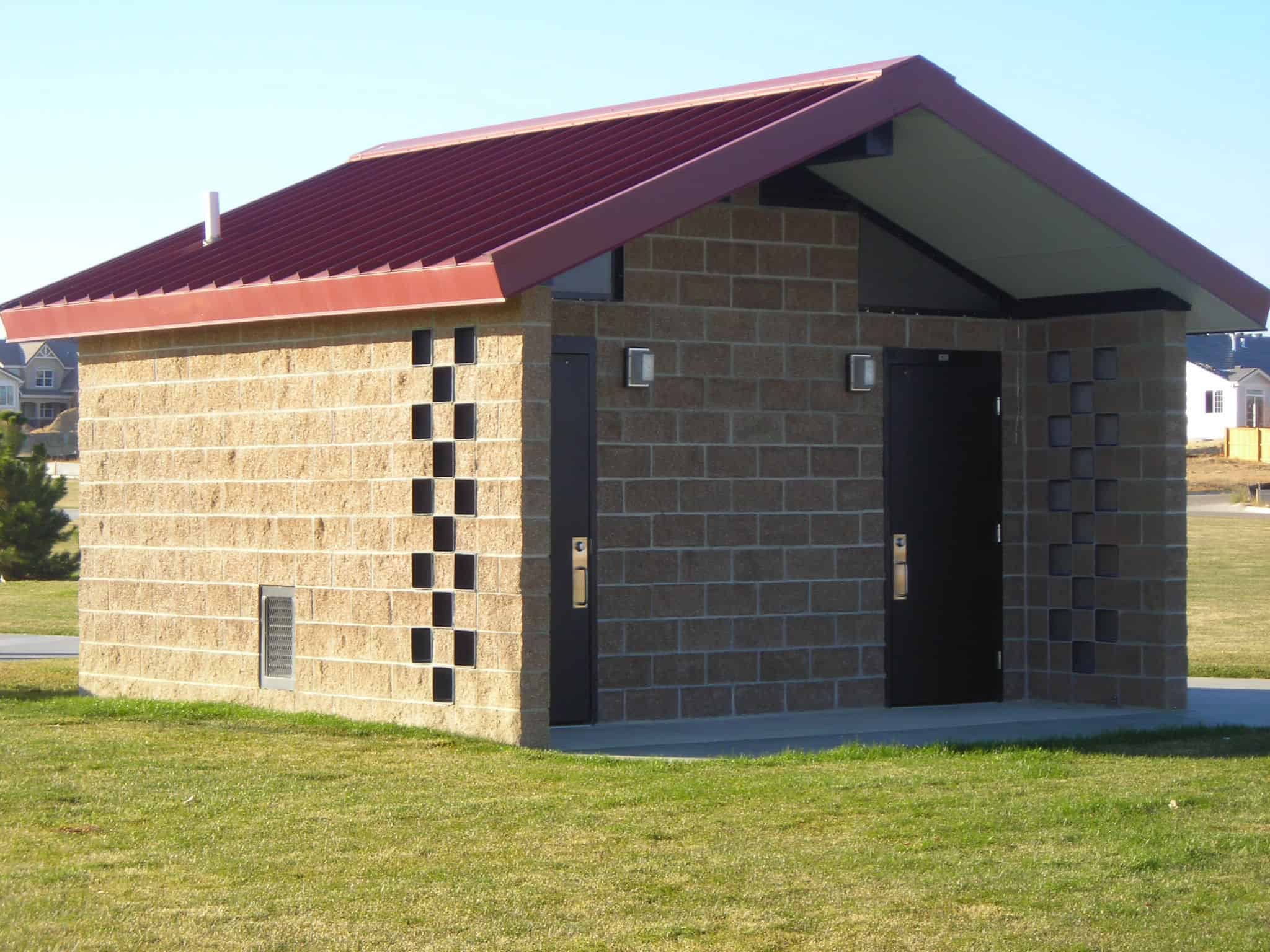 Romtec had the privilege of providing the city of Brighton, Colorado with several restroom facilities. One of these was in Farmer’s Park, located in the middle of one of Brighton’s neighborhoods. The park provides the community with a place to spend their leisure time. Offering a playground, basketball court, soccer field, and picnic shelter. Romtec was able to design and manufacture this restroom to match a picnic shelter that was already at the park. The building was constructed out of affordable and common materials, making it perfect for the City’s budget and easy to install for its contractors.