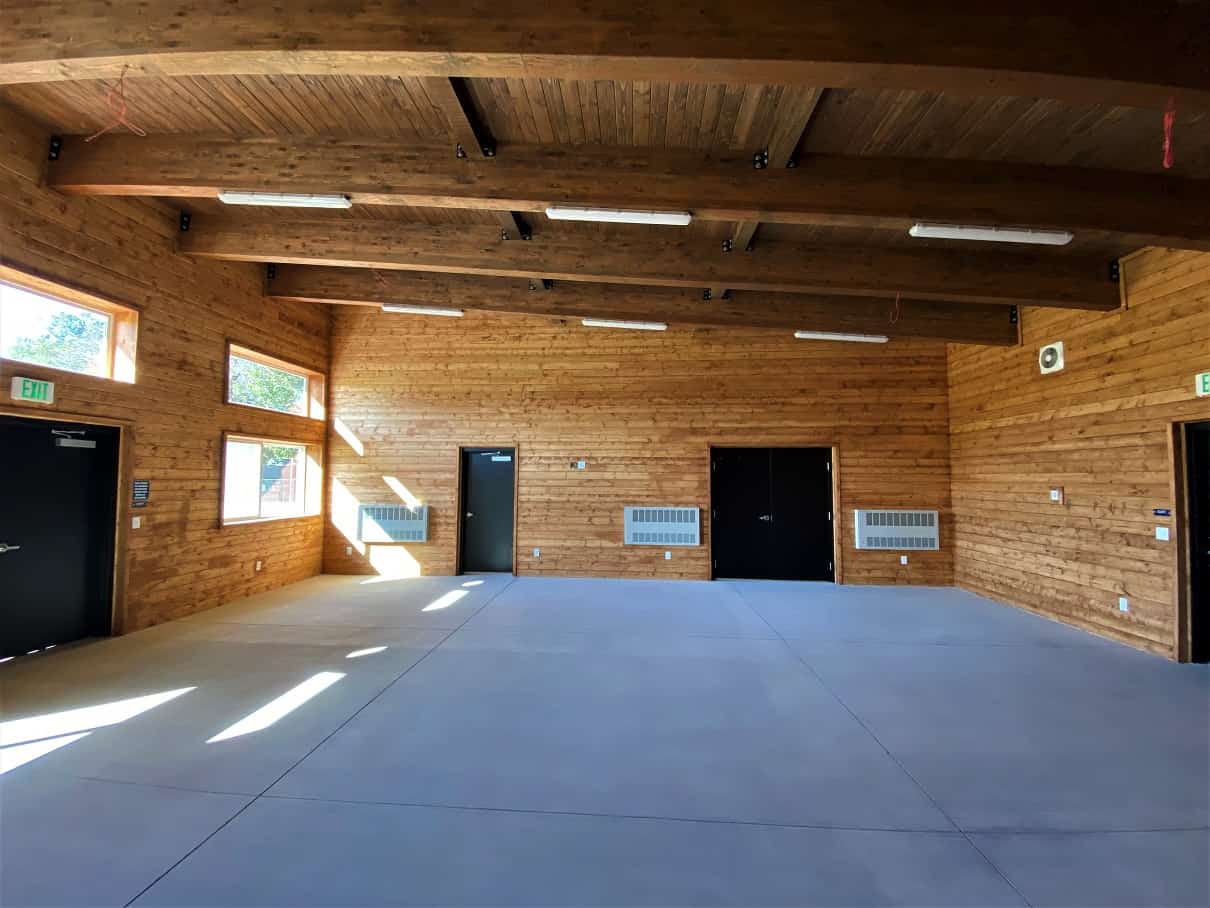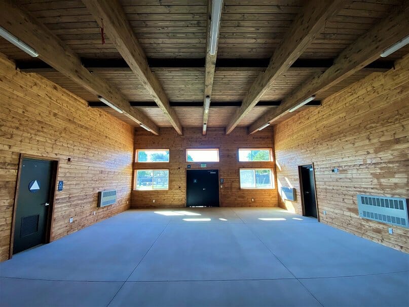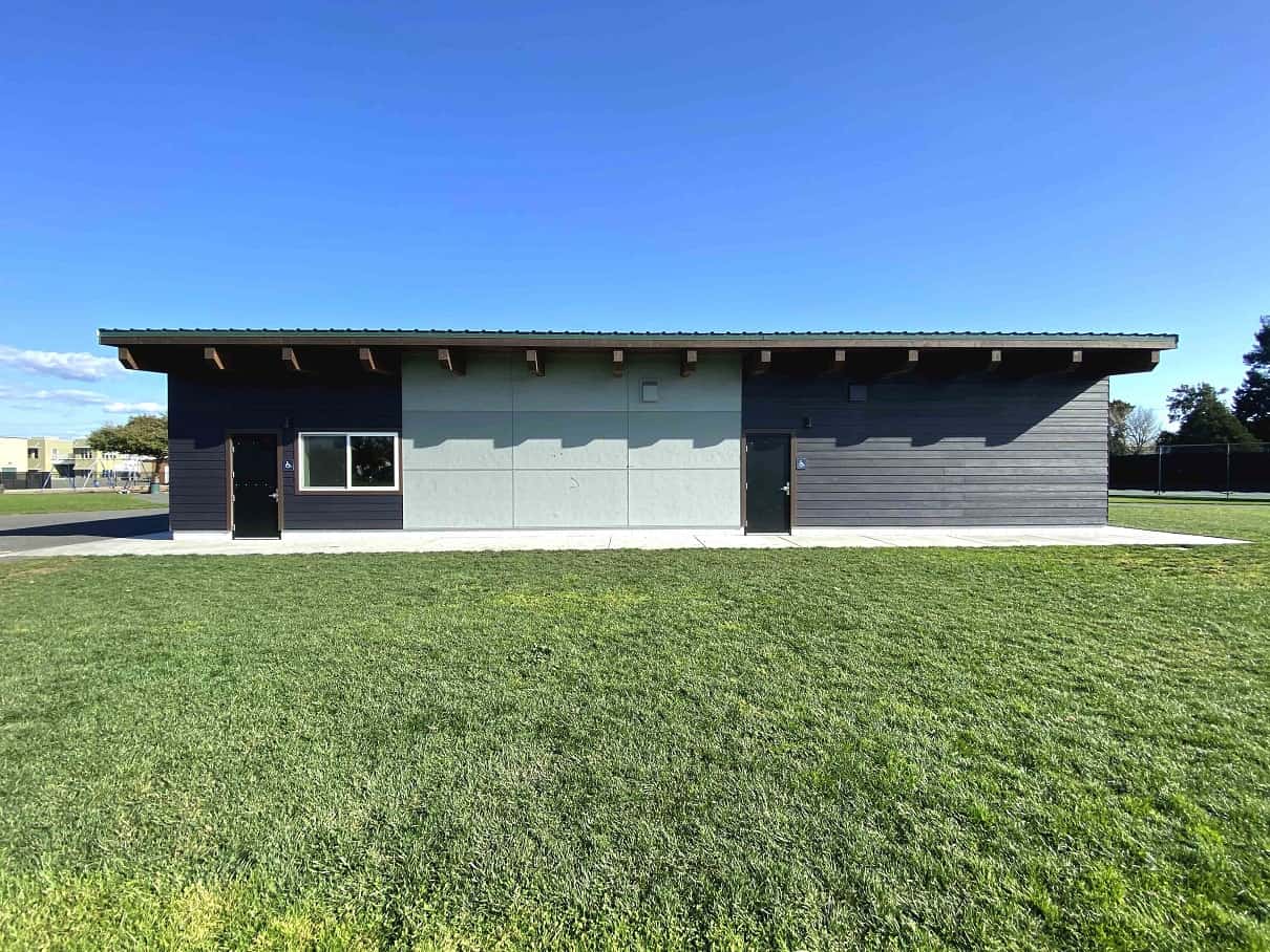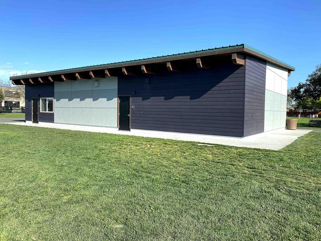 The new recreation center is a custom building with a single slope roof that extends over the front and rear of the structure. This building’s design combines stucco siding panels and lap siding for a modern mix of textures and materials that are aesthetically pleasing. Men’s and Women’s restrooms are accessible from the exterior of the building, as well as the mechanical room, kitchen, and multi-purpose room. The multi-purpose room features multiple entrances, as well as interior entrances to a gender-neutral bathroom, an office, and a storage room that cannot be accessed from the outside.