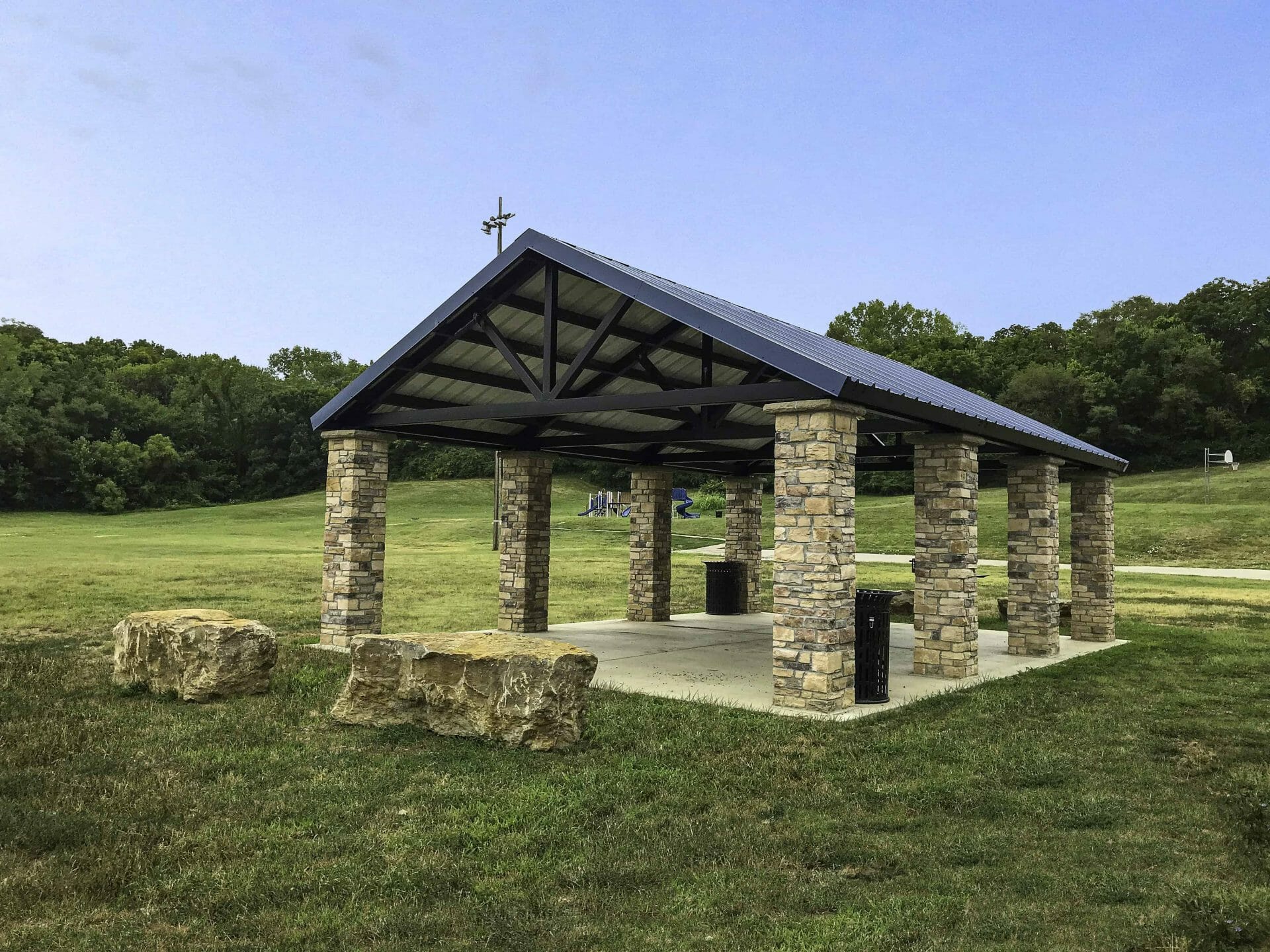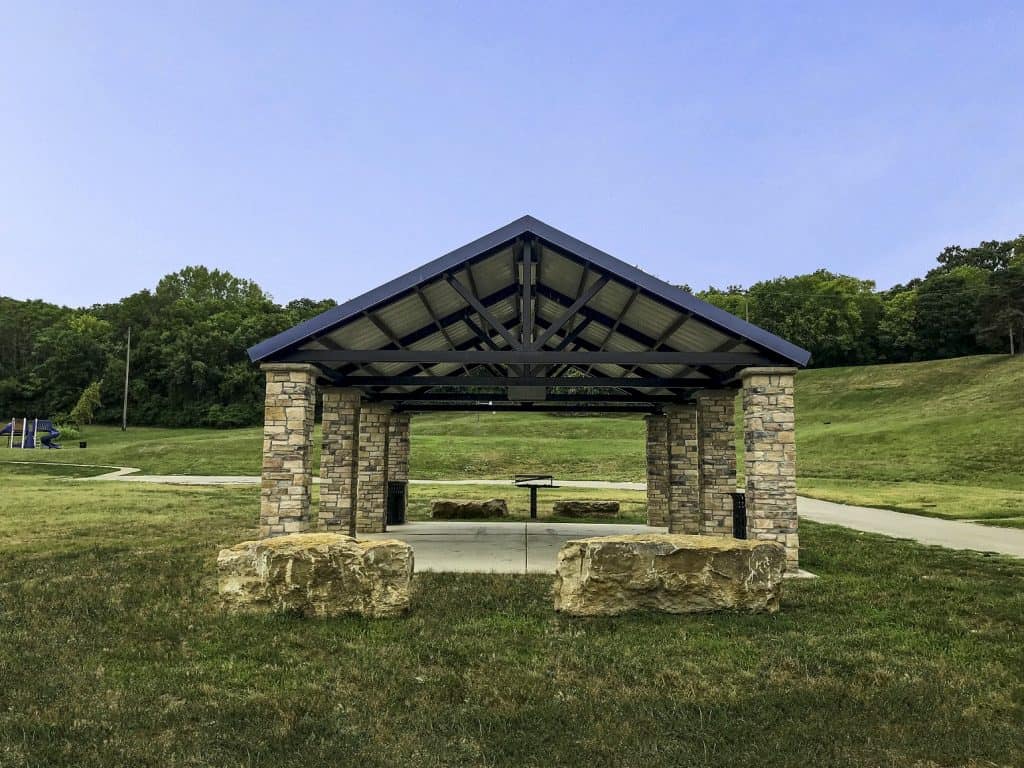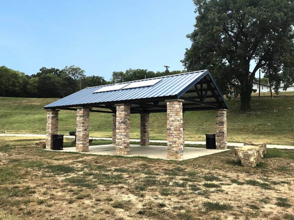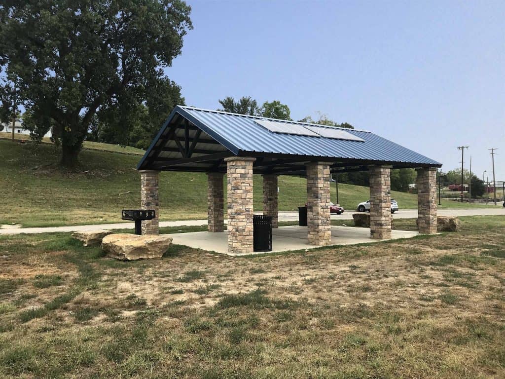 Romtec designed, supplied, and installed a large new steel pavilion at Liberty Park in Kansas City, Missouri. Liberty Park is a 17-acre park with a ballfield, playground, and plenty of open space. The new Romtec shelter includes several features to improve energy efficiency with design features to give it a breathtaking appearance. Solar panels are installed on the roof of the building to provide a reliable source of sustainable power for the lighting in the pavilion. The addition of solar power in the structure required Romtec to install an enclosure in the roof structure to protect it from being meddled with. Full height column wraps of ledgestone, colored metal roofing, and steel roof trusses give this pavilion a unique and appealing aesthetic. This addition to Liberty Park is one of many improvements the Kansas City Parks & Recreation department is working on as part of their master plan!