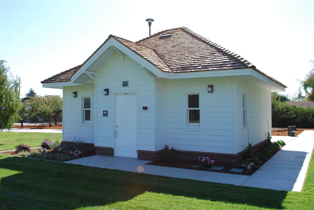 The restroom building features red gable roofs, cedar shake roofing, wood double-hung windows, a storage room, Hardie plank lap siding, and skylights. This beautiful restroom building matches the aesthetic of the Meek Mansion and showcases how Romtec can match a specific theme or a building.