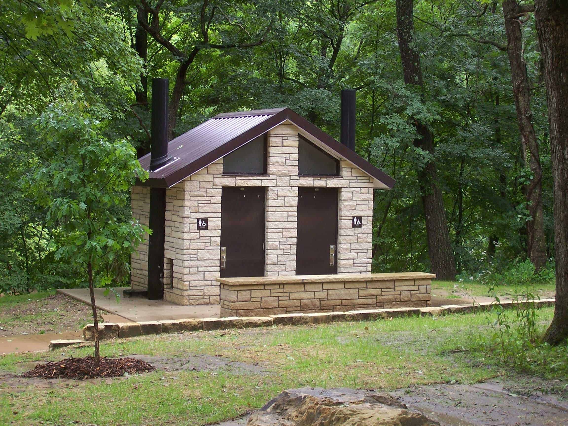 This site-built structure was constructed right in the trees without disturbing the surrounding park. The restroom building features a metal roof, vent pipes, Lexan windows, and limestone siding that fits perfectly into this forested area.