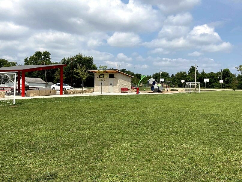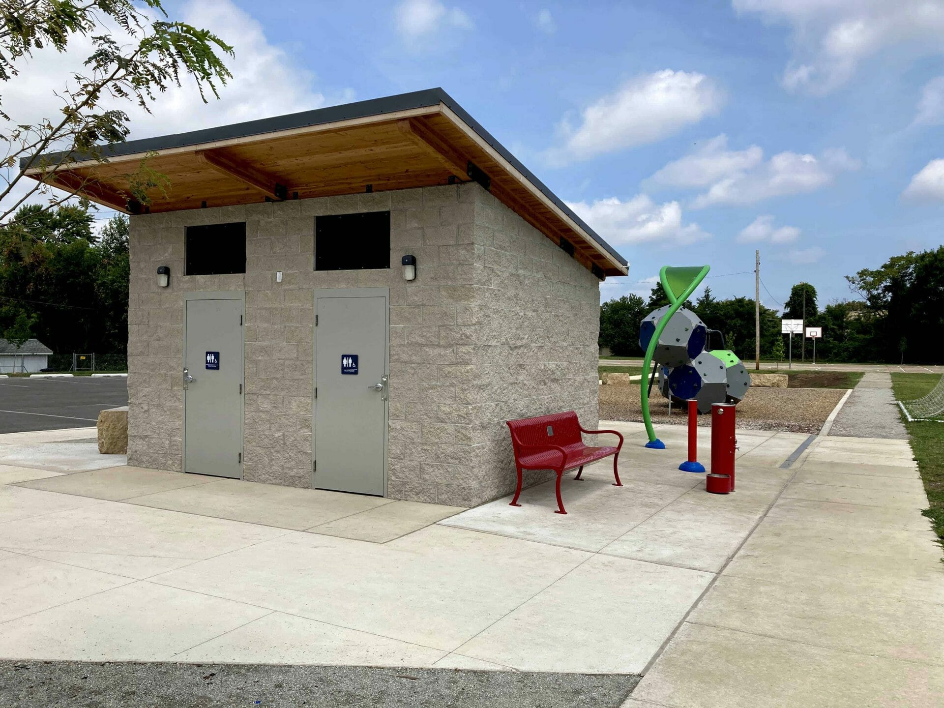 In addition to the Romtec supplied restroom, Pulaski Park also underwent numerous upgrades including a new paved parking lot, a comfort station, ADA accessible paths, a splash feature, an irrigated soccer field, landscaping and trees, and new signage.