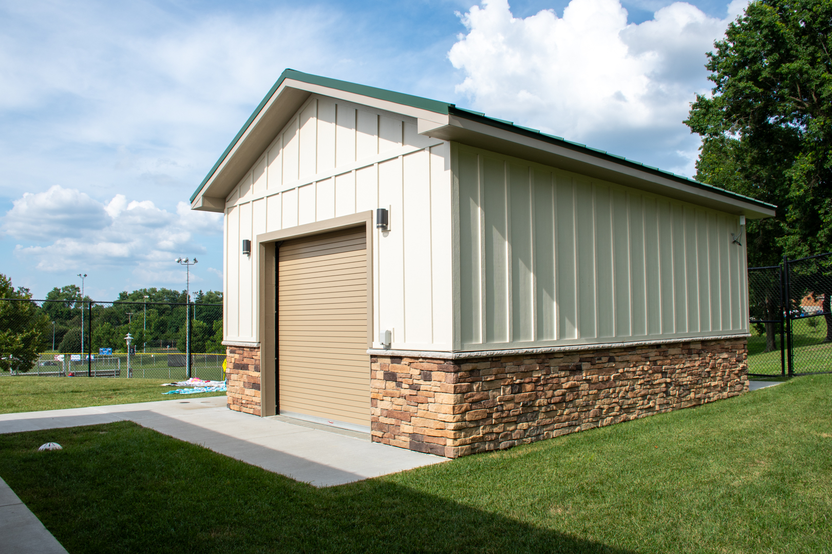 The utility building has a utility room, with a roll up garage door, and a specific space for the chlorine storage. The utility building was designed to match the restrooms with a Fabral metal roof, exhaust fan, Overhead Door roll up garage door which naturally ventilates the building, ridge vent, Intermatic photocell under the roof overhang, fiber cement board and batten siding over CMU concrete block wall, and Eldorado Stone siding, LCN door closers, Lithonia lighting,