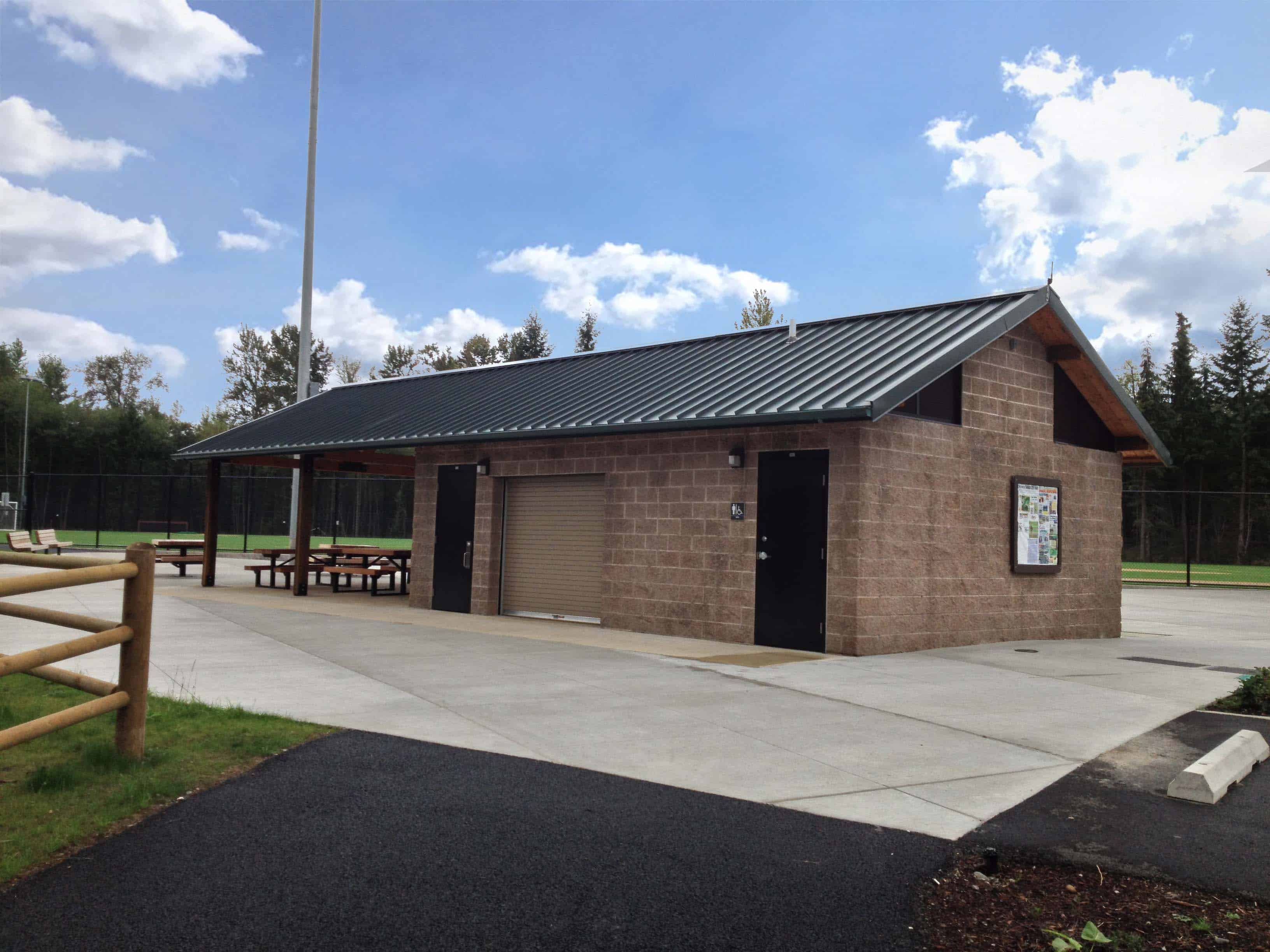 With the concession building’s roll-up door, concession window, picnic area, and six unisex restrooms, this building is perfect for many different occasions and park activities.