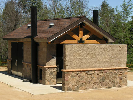 Romtec was thrilled with the idea of designing a unique vault restroom, as these are often seen as “cookie-cutter” buildings with no potential for architectural originality. The county was giving Romtec a chance to show that a waterless restroom could also be a statement in design, sustainability, and environmental friendliness. Romtec designed the El Capitan vault restroom and storage building specifically for this beautiful park and trailhead. They designed a unique roof structure using brown three-tab shingles, including a rough-sawn lumber truss detail, and privacy wall. The exterior would have a stone veneer wainscoting with split-face tan block. Romtec provided full double doors to the storage and maintenance room, allowing not only for tools and equipment but also small vehicles for park and trail maintenance. The results are stunning and the building is quickly becoming one of the most requested design schemes by new customers in need of a waterless facility, with the standard SST technology, but with a look usually associated with restrooms having full plumbing and electrical capabilities. San Diego County and Romtec have proven that waterless can be convenient, functional, easy to maintain, and beautiful all at the same time.
